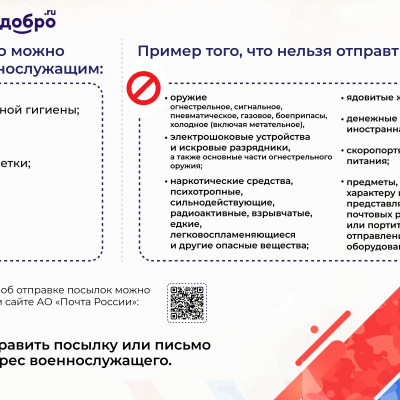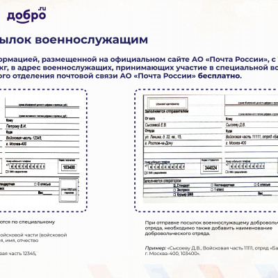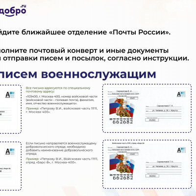 В рамках реализации проекта взаимопомощи #МЫВМЕСТЕ Ассоциацией волонтёрских движений совместно с Министерством обороны РФ представлен методический материал по отправке писем и посылок военнослужащим на линию боевого соприкосновения через отделения "Почты России".
