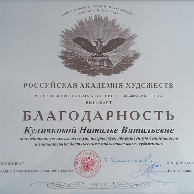 Почётную благодарность от президента РАХ, Народного художника России, Посла Доброй воли ЮНЕСКО, профессора З.К. Церетели получила преподаватель живописи нашей школы Куличкова Наталья Витальевна за плодотворную педагогическую, творческую, общественную деятельность и значительные достижения в подготовке юных художников.